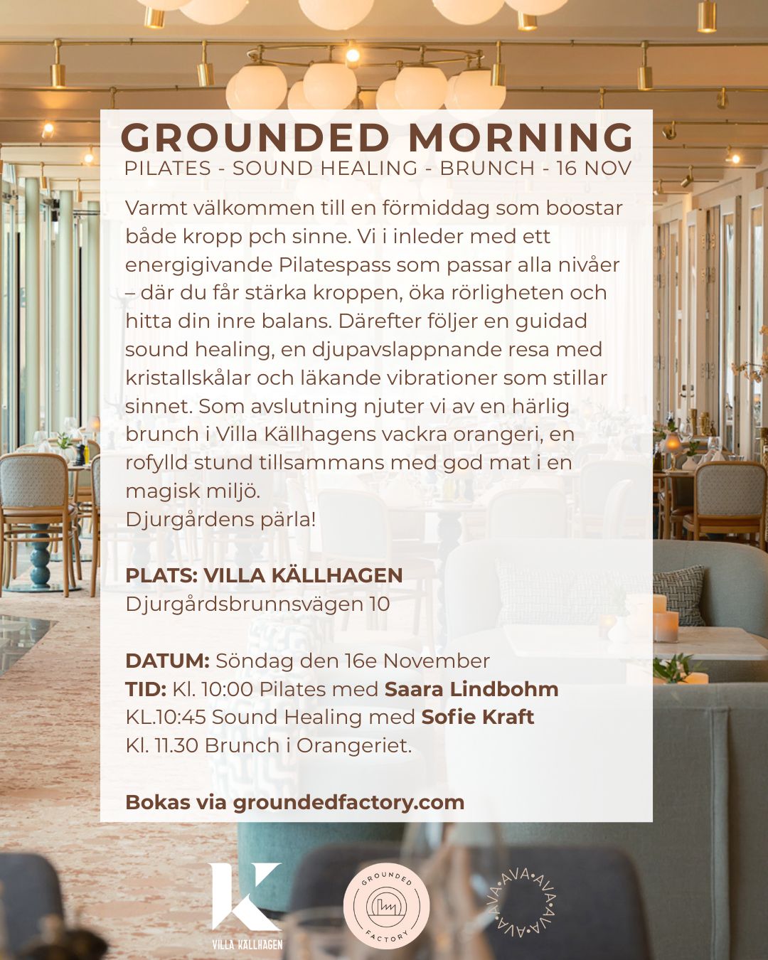 Time: 10:00 Pilates with Saara Lindbohm, 10:45 Sound Bath with Sofie Kraft. Brunch Approx 11:30.